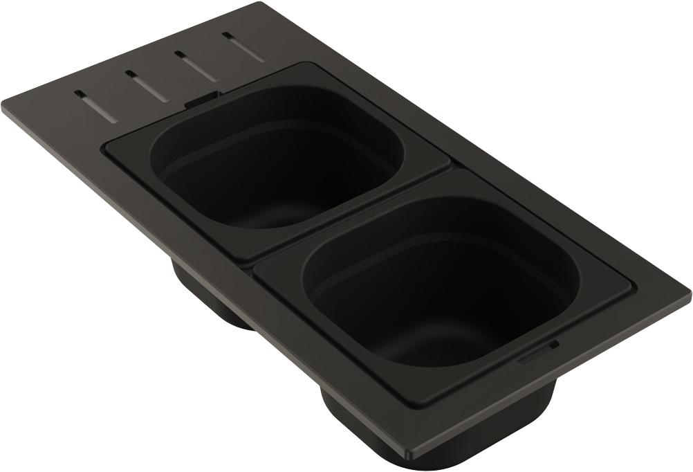 Контейнеры коллекции DC представляют собой различные конфигурации, состоящие из нескольких элементов: одной, двух или трех чаш, изготовленных из нержавеющей стали и фиксирующей подставки, изготовленной из высокопрочного HPL пластика. Чаши свободно вынимаются из пластиковой подставки и перемещаются, а конструкция подставки разработана таким образом, чтобы ее можно было удобно разместить на внутренних ступенчатых направляющих моек, коллекций SINTESI и KITAGAWA.