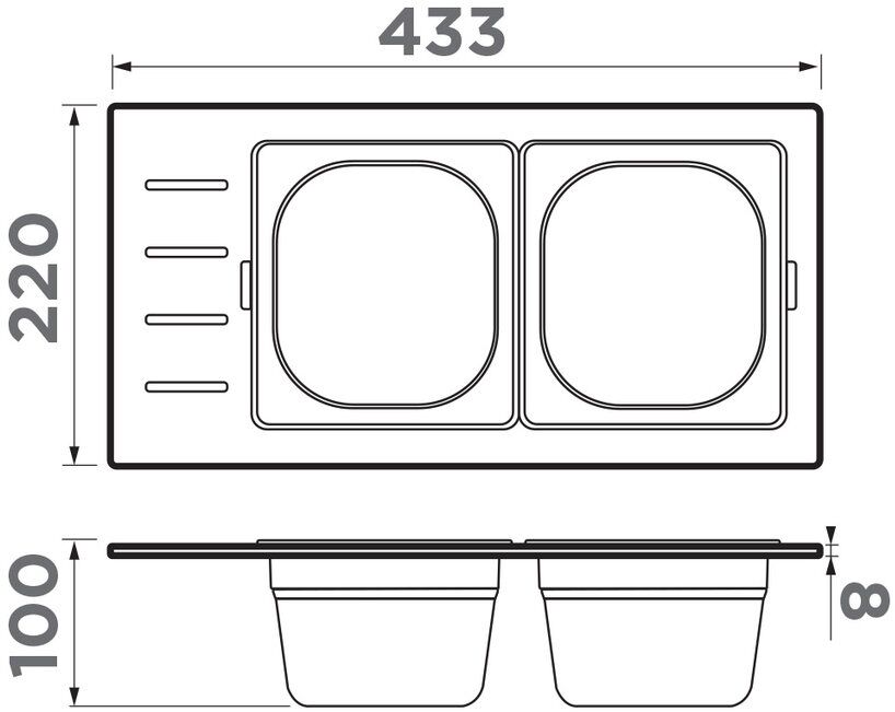Контейнеры коллекции DC представляют собой различные конфигурации, состоящие из нескольких элементов: одной, двух или трех чаш, изготовленных из нержавеющей стали и фиксирующей подставки, изготовленной из высокопрочного HPL пластика. Чаши свободно вынимаются из пластиковой подставки и перемещаются, а конструкция подставки разработана таким образом, чтобы ее можно было удобно разместить на внутренних ступенчатых направляющих моек, коллекций SINTESI и KITAGAWA.
