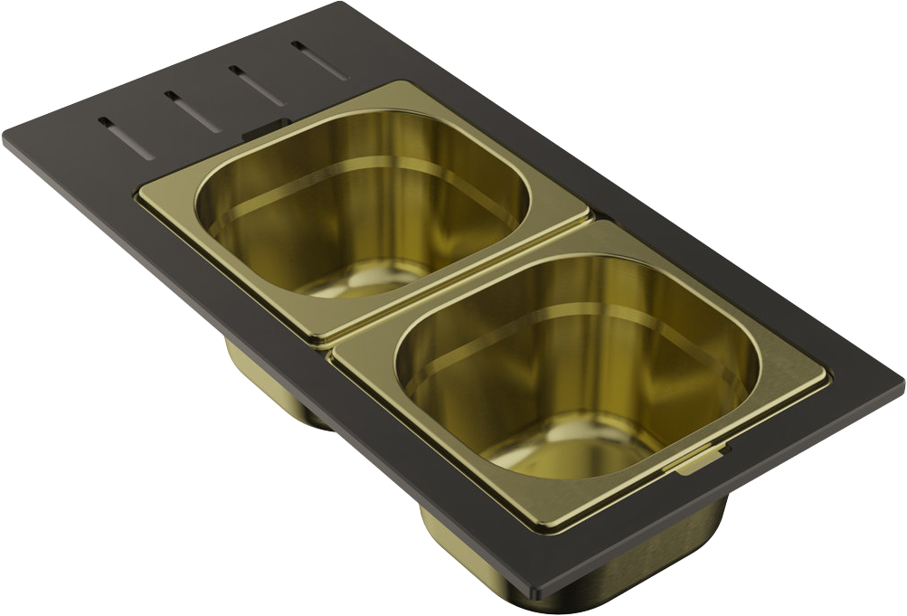 Контейнеры коллекции DC представляют собой различные конфигурации, состоящие из нескольких элементов: одной, двух или трех чаш, изготовленных из нержавеющей стали и фиксирующей подставки, изготовленной из высокопрочного HPL пластика. Чаши свободно вынимаются из пластиковой подставки и перемещаются, а конструкция подставки разработана таким образом, чтобы ее можно было удобно разместить на внутренних ступенчатых направляющих моек, коллекций SINTESI и KITAGAWA.
