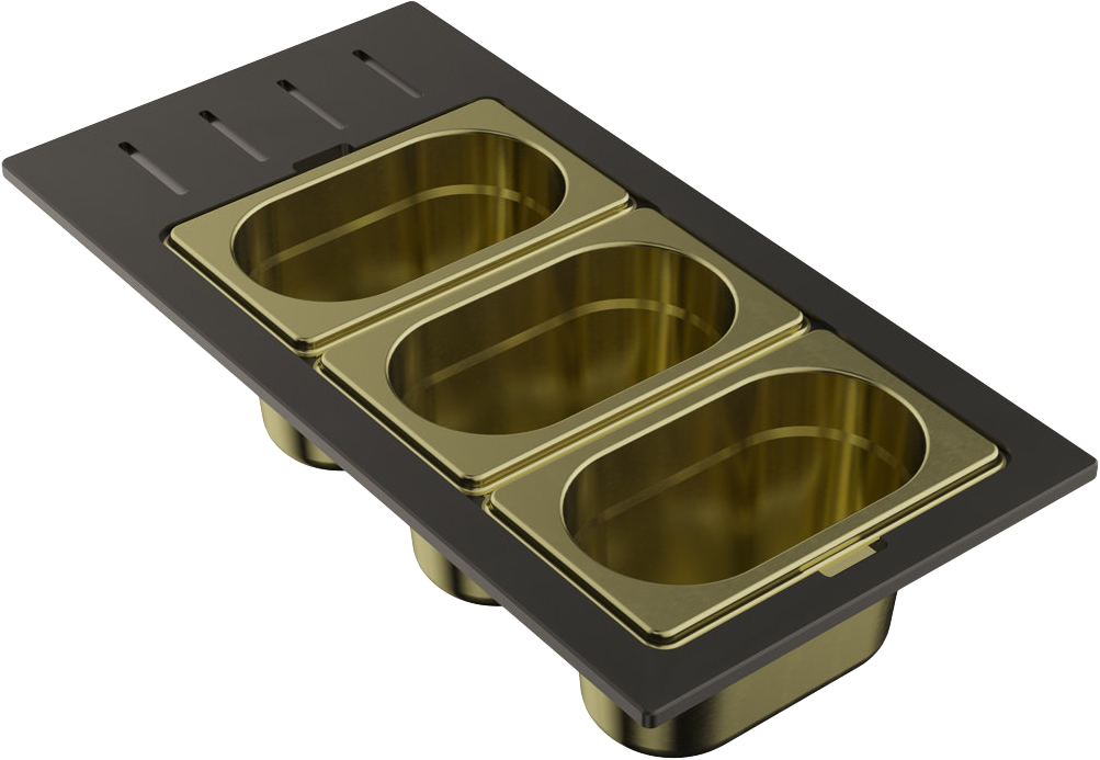 Контейнеры коллекции DC представляют собой различные конфигурации, состоящие из нескольких элементов: одной, двух или трех чаш, изготовленных из нержавеющей стали и фиксирующей подставки, изготовленной из высокопрочного HPL пластика. Чаши свободно вынимаются из пластиковой подставки и перемещаются, а конструкция подставки разработана таким образом, чтобы ее можно было удобно разместить на внутренних ступенчатых направляющих моек, коллекций SINTESI и KITAGAWA.