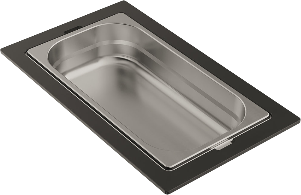 Контейнеры коллекции DC представляют собой различные конфигурации, состоящие из нескольких элементов: одной, двух или трех чаш, изготовленных из нержавеющей стали и фиксирующей подставки, изготовленной из высокопрочного HPL пластика. Чаши свободно вынимаются из пластиковой подставки и перемещаются, а конструкция подставки разработана таким образом, чтобы ее можно было удобно разместить на внутренних ступенчатых направляющих моек, коллекций SINTESI и KITAGAWA.