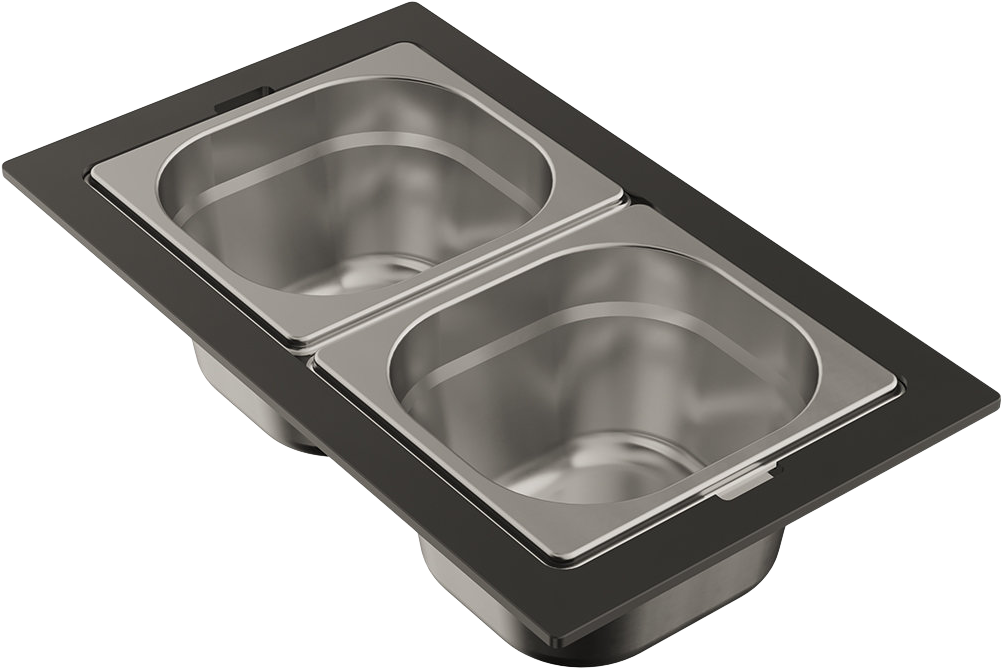 Контейнеры коллекции DC представляют собой различные конфигурации, состоящие из нескольких элементов: одной, двух или трех чаш, изготовленных из нержавеющей стали и фиксирующей подставки, изготовленной из высокопрочного HPL пластика. Чаши свободно вынимаются из пластиковой подставки и перемещаются, а конструкция подставки разработана таким образом, чтобы ее можно было удобно разместить на внутренних ступенчатых направляющих моек, коллекций SINTESI и KITAGAWA.
