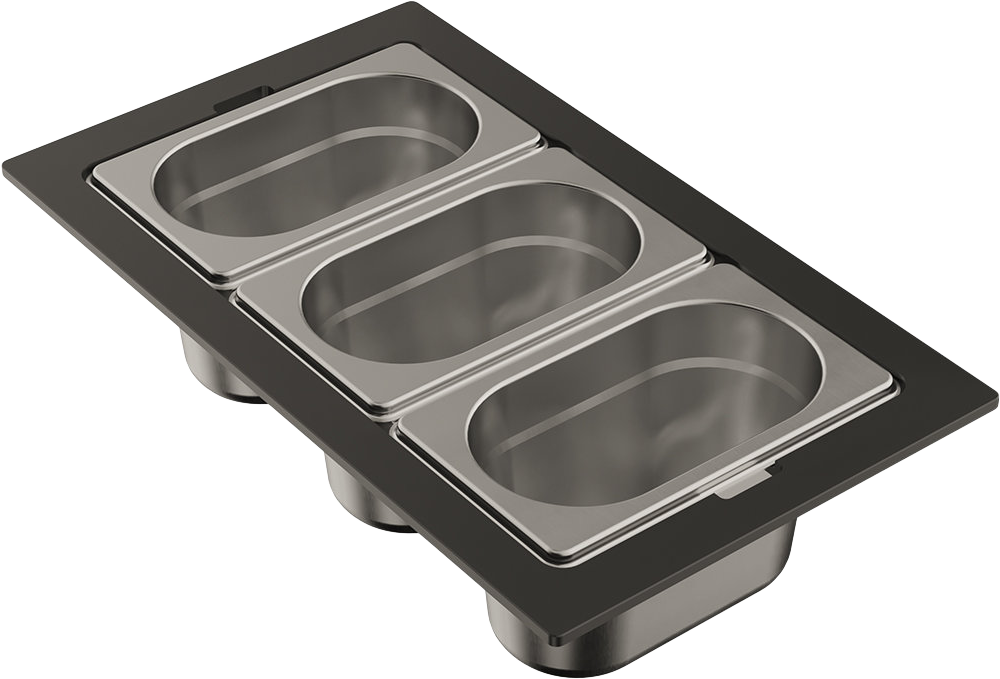Контейнеры коллекции DC представляют собой различные конфигурации, состоящие из нескольких элементов: одной, двух или трех чаш, изготовленных из нержавеющей стали и фиксирующей подставки, изготовленной из высокопрочного HPL пластика. Чаши свободно вынимаются из пластиковой подставки и перемещаются, а конструкция подставки разработана таким образом, чтобы ее можно было удобно разместить на внутренних ступенчатых направляющих моек, коллекций SINTESI и KITAGAWA.