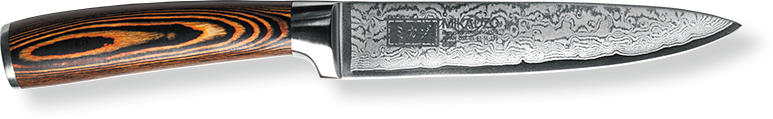 Японский универсальный нож Mikadzo DAMASCUS SUMINAGASHI с длиной клинка 127 мм из темной дамасской стали. Сочетание сверхтвердой стали VG-10, легированной кобальтом и молибденом, и 68 слоев разноуглеродистой стали делают нож максимально прочным, острым и долговечным. Визитной карточкой дамасской стали является уникальный рисунок лезвия, который невозможно подделать.
