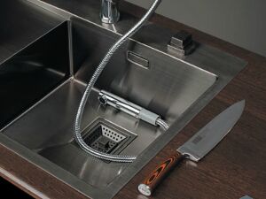 Мойки с тремя и более чашами требуют довольно много пространства для установки, зато очень вместительны. Располагаться они могут как в одну линию, так и под углом к крану. Но такие модели предъявляют дополнительные требования к сантехнике, в частности к смесителю. Он должен быть качественным и очень прочным, чтобы выдерживать постоянные повороты. Кран требуется особой конструкции, на гибком шланге.