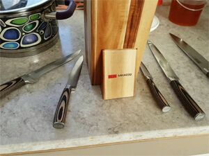 Превосходные характеристики кухонных ножей от компании Mikadzo обуславливаются постоянным совершенствованием технологий производства в сочетании с традиционными методиками, известными мастерам еще множество столетий назад. Отличительная черта всей продукции этого бренда – это уникальное сочетание легендарной дамасской стали и специального материала. Он представляет собой композит, состоящий из натурального древесного среза, пропитанного смолой. Благодаря такой обработке древесина не рассохнется под воздействием влаги, а также не будет впитывать жир.