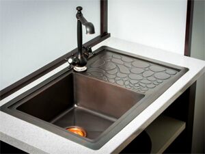 Медь – это материал, имеющий природные антибактериальные свойства. Поэтому микробы, для которых кухня является наиболее благоприятной средой обитания, быстро гибнут при соприкосновении с металлом, тогда как на раковине из обычной нержавеющей стали они способны прожить несколько недель.