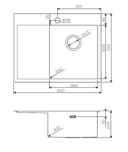 Конструкция раковины состоит из одной чаши и крыла. Оно создает дополнительную рабочую площадь для хранения посуды и защиты столешницы от влаги. Поверхность крыла имеет небольшой уклон для эффективного стока воды. Чаша по своей форме приближена к квадрату, по длине составляет 360 мм, а по ширине – 400 мм. Глубина мойки – 200 мм. Корпус изготовлен по инновационной шумоподавляющей технологии, состоящей из двух компонентов: антишумового состава и резиновых накладок с четырех сторон.