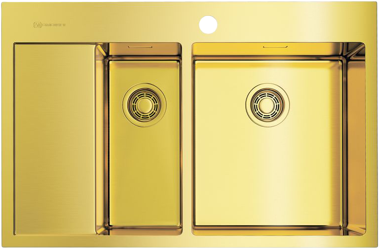 Невероятно красивая модель цвета светлого золота заставит вашу кухню сиять. Мойка изготовлена из превосходной хромоникелевой нержавейки с PVD-напылением. У модели две чаши большая и маленькая, а также крыло, на котором можно разместить посуду, фрукты, овощи, мясо, рыбу и другие продукты. В маленькой чаше удобно размораживать заготовки из холодильника, большая предназначена для остальных задач. В мойке имеется отверстие для смесителя, так что при монтаже у сантехника не возникнет сложностей.