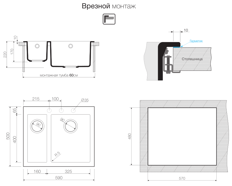 - Отверстие под смеситель Нет