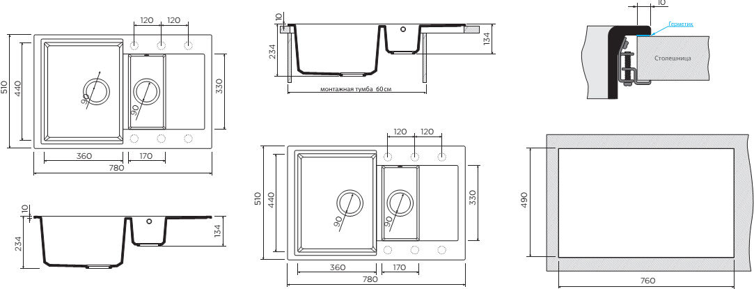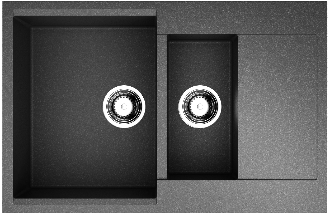 Эта мойка предназначена для средней или большой кухни: размеры модели составляют 780 х 510 мм. Раковина с двумя чашами и крылом делает рабочую зону максимально функциональной. Габариты основной чаши – стандартные (440 х 345 мм), это вместительная емкость для мытья посуды. Вспомогательная чаша заметно меньше и подходит, к примеру, для мытья овощей и фруктов – очень удобное разделение рабочих процессов. Высота раковины равна 234 мм.