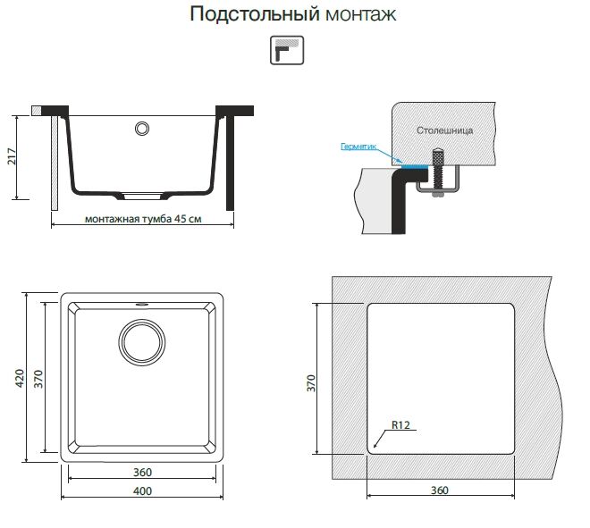 Прямоугольная мойка габаритами 400 х 420 мм имеет единственную чашу размерами 370 х 360 х 220 мм и устанавливается под столешницу. Кухонная раковина изготовлена из искусственного гранита, который по прочности лишь незначительно уступает алмазу. Artgranit изготавливается методом литья на основе твердых кварцевых и гранитных частиц, а также прочного связующего компонента. Материал не деформируется, не царапается и не разрушается от ударов посуды, не тускнеет и не пригорает от высоких температур, не портится под воздействием агрессивной химии. Более подробно о преимуществах полимера можно прочитать в статье по ссылке.