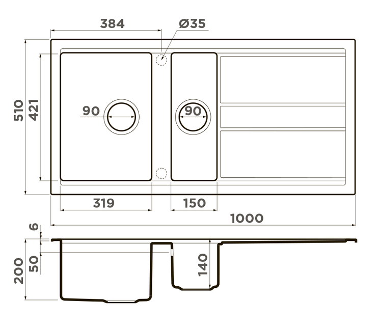 - Диаметр слива 3 ½” (90 мм)