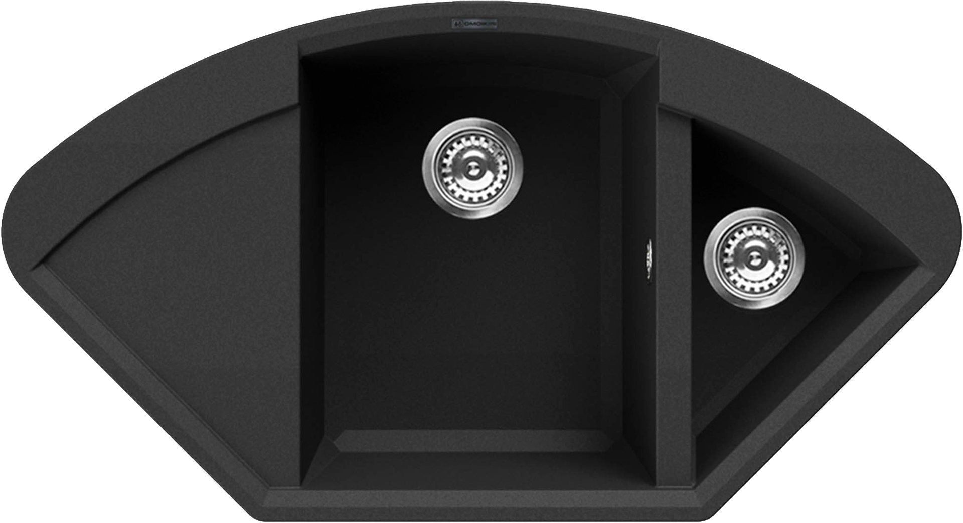 Модель нестандартной конфигурации изготовлена из искусственного гранита (Tetogranit) черного цвета. Мойка оснащена двумя чашами – прямоугольной для посуды и треугольной для продуктов. Меньшее отделение имеет габариты 247 х 409 мм и глубину 165 мм, большее (посудное) – 394 х 504 мм и глубину 230 мм. Раковина относится к необорачиваемым моделям, слева от большой чаши располагается крыло для сушки посуды.