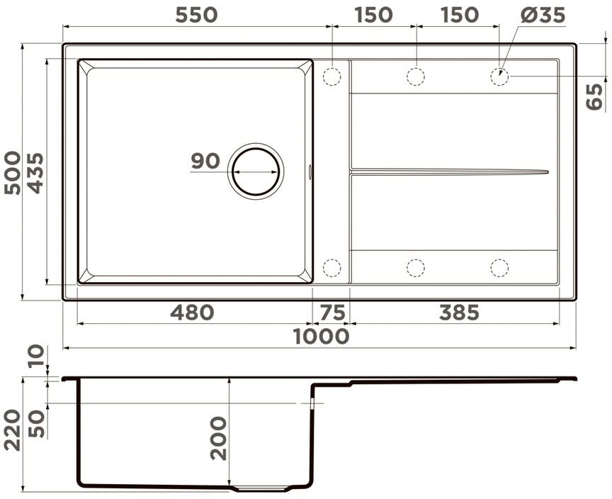 - Отверстие под смеситель Нет