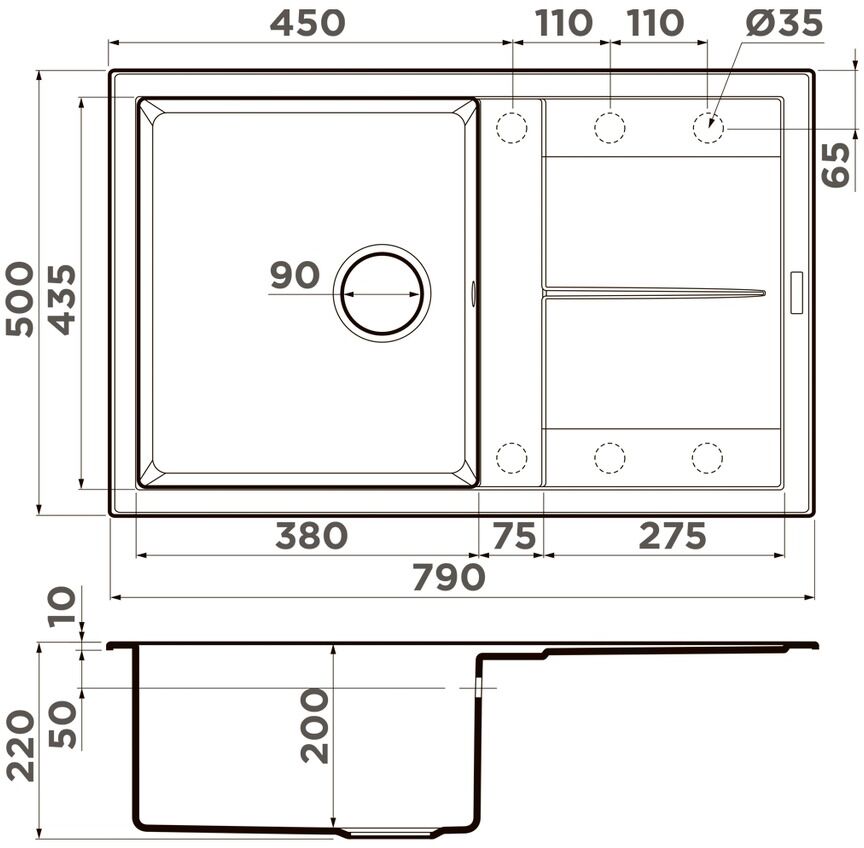 - Отверстие под смеситель Нет