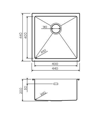 Мойка квадратной формы габаритами 44 см имеет размеры чаши 40 х 40 х 20 см. Глубина отделения при удачном выборе смесителя позволяет удобно мыть любую посуды, в том числе габаритные кастрюли и сковородки. Раковина относится к необорачиваемым моделям и устанавливается только так, как указано в инструкции по эксплуатации, методом врезки в столешницу.