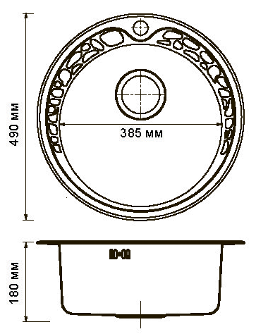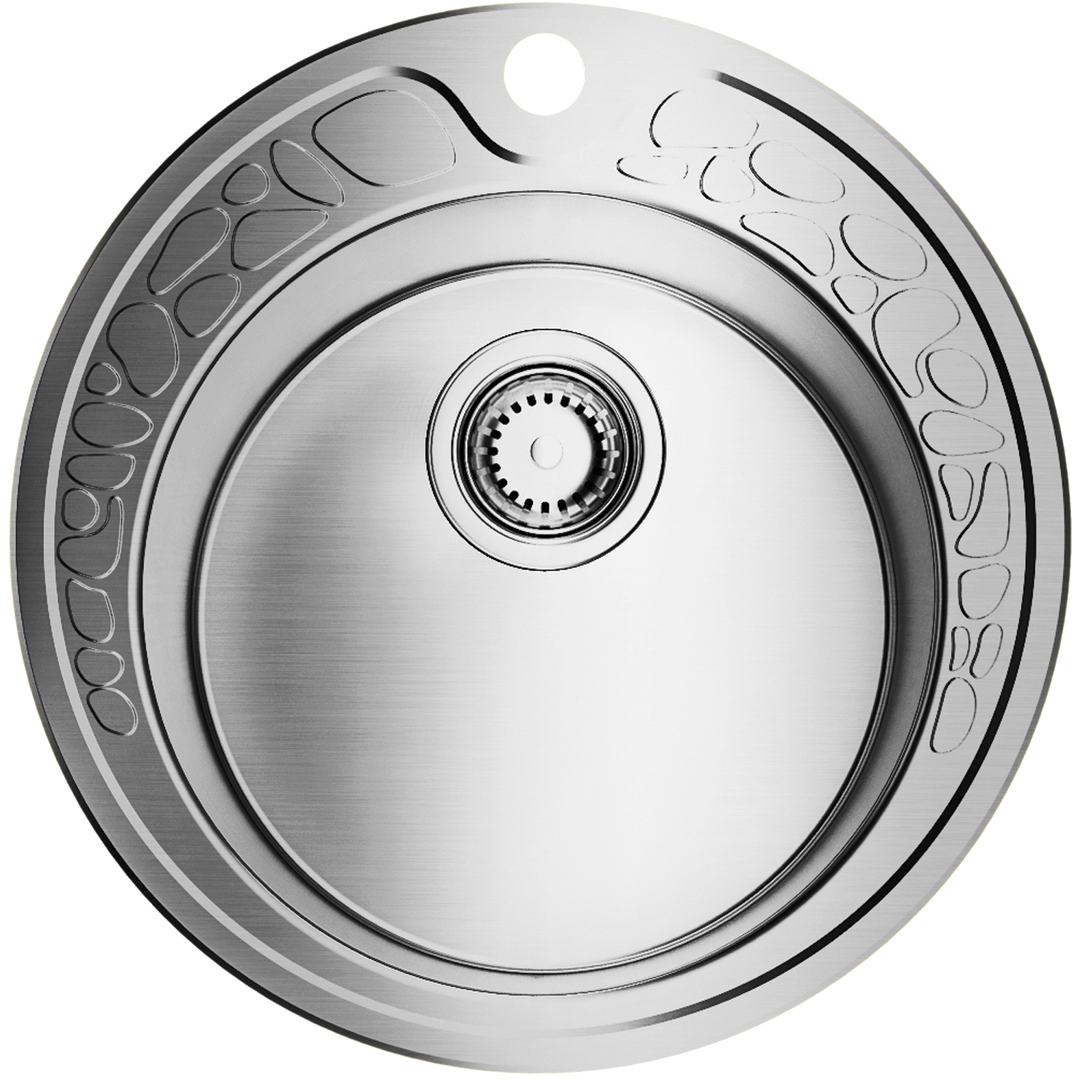 Круглая мойка врезного типа идеально впишется в интерьер классической кухни. Оригинальный рельефный узор на бортике особенно выгодно смотрится в сочетании со смесителями, выполненными в винтажном стиле. Диаметр чаши составляет 385 мм, глубина – 180 мм, для монтажа оптимально подойдет кухонная тумба шириной 450 мм.