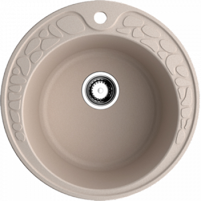 Круглые модели моек удобны тем, что их можно располагать в любом месте столешницы – по центру, со смещением вправо или влево, в углу. Бежевая врезная модель из искусственного гранита имеет несколько важных особенностей. Начнем с размера: полный диаметр мойки – 51 см, из которых 39,5 см приходится на слегка смещенную вперед чашу глубиной 207 мм. За счет этого смещения удалось решить сразу две задачи. Во-первых, владельцам не придется слишком сильно наклоняться вперед при использовании мойки. Во-вторых, на дальней стороне удалось разместить украшенный рельефным узором ободок с проделанным посередине отверстием для смесителя. Это упрощает его монтаж и позволяет установить мойку максимально близко к стене.