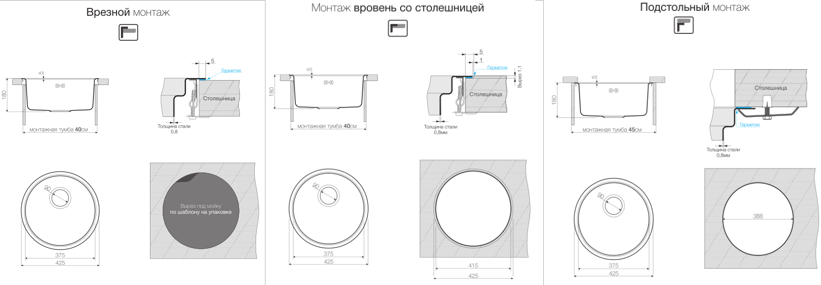 Тип монтажа: под столешницу, вровень со столешницей, врезной монтаж