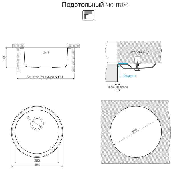 Мы не раз говорили о типах моек и преимуществах разных форм. В этом разделе представлена идеально круглая и компактная модель для ценителей строгих решений. Дизайн выглядит лаконично, никаких лишних деталей или неуместных элементов декора. Такая мойка круглой формы отлично впишется в современный минималистичный интерьер, выполненный в стиле хай-тек или лофт. Изделие кажется монолитным, а отсутствие инженерных отверстий в верхней части и идеально круглая форма чаши лишь усиливают этот эффект. Внешнее впечатление полностью соответствует характеристикам: мойка действительно надежная и устойчивая, этому способствуют стенки толщиной 0,8 мм и масса – 2,6 кг. Простота формы и надежная технология монтажа позволяют органично интегрировать такую сантехнику в столешницу из любого материала.