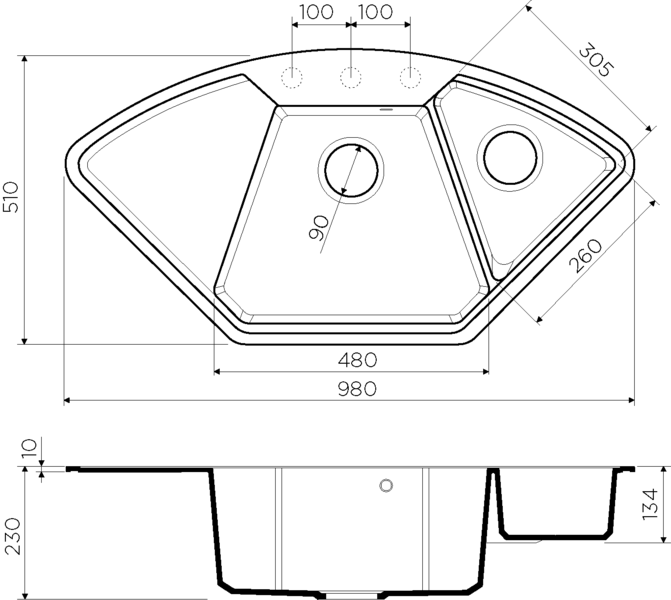Боковое крыло не только помогает подчеркнуть закругленную форму, но еще и дает пользователю дополнительную полезную площадь для хранения посуды. Хотя изначально эта часть нужна для сушки столовых приборов и защиты столешницы от воды. Как видите, эргономичная конструкция продумана до мелочей. Размеры этой модели составляют 980 мм по длине и 510 мм по ширине, глубина чаш – по 230 мм.