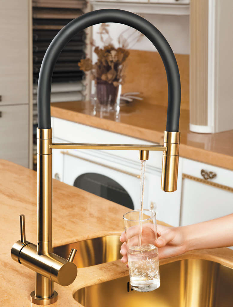 Представляем вашему вниманию новинку – смеситель с запатентованной конструкцией из гибкого излива и крана подачи питьевой воды. Модель хоть и занимает немало места (550 мм по высоте), но крайне полезна и удобна в эксплуатации. Основа конструкции – база с рычагами и излив, через который подается фильтрованная вода. На его конце есть специальная насадка для фиксации гибкого шланга. Смеситель, несмотря на габариты, эргономичен и не мешает мытью посуды, потому что поворачивается на 360 градусов. Это идеальная сантехника для большой двухчашевой раковины.