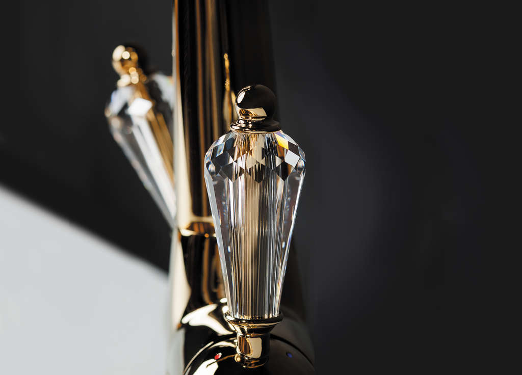 Оригинальный смеситель, который превосходно подойдет к интерьеру, выполненному в стиле классика. Особенностью модели являются рычаги, украшенные прозрачными кристаллами Swarovski, которые хорошо гармонируют с декоративным покрытием золотого оттенка.