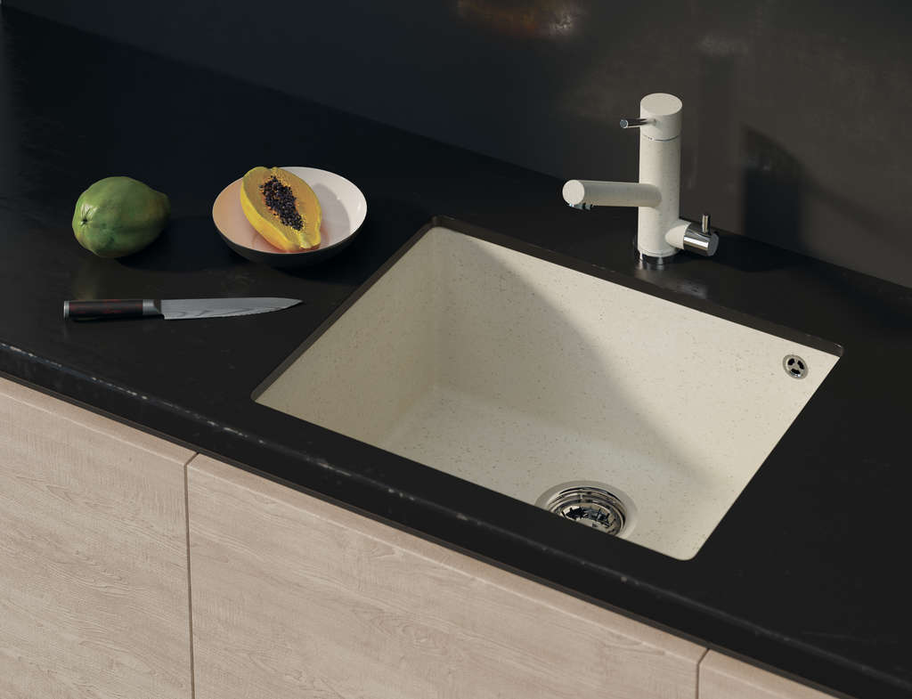 Смеситель принадлежит к серии Tonami – технике с рычажным управлением и расположенным под углом прямым изливом. Один рычаг находится сверху, другой – сбоку, трубки для подключения и крепежи входят в комплектацию. Модели этой коллекции хорошо сочетаются с мойками из искусственного гранита темного оттенка.