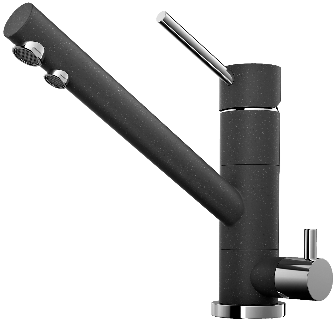 Смеситель имеет ультрасовременный дизайн, что выражается в лаконичной форме и наличии присущих хай-тек и модерн стилистике материалам во внешнем оформлении. Корпус и излив кухонного крана покрыты слоем искусственного гранита черного цвета, в который органично вписываются серебристые рукоятки и основание. Материал корпуса – высококачественная латунь, которая стойко противостоит механическим воздействиям, не окисляется во влажной среде и не содержит свинец.