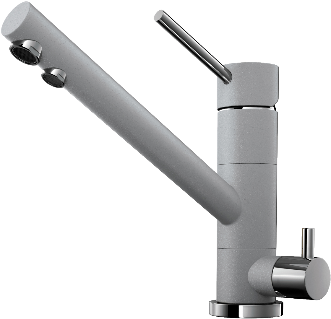 Декоративное покрытие смесителя серого цвета. Этот особый оттенок под названием Leningrad Grey был навеян особой атмосферой города на Неве и превосходно вписывается в интерьеры, оформленные в современном стиле. Покрытие имитирует текстуру гранита, поэтому вы можете составить комплект, подобрав мойку из искусственного камня аналогичного оттенка.