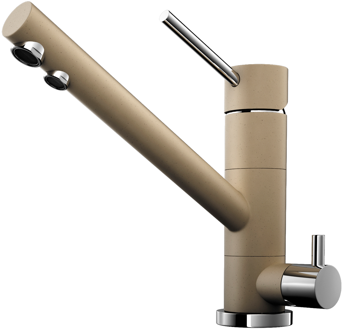 Рычажный смеситель из серии Tonami выполнен в необычном ультрасовременном дизайне. Благодаря декоративному покрытию цвета «шампань», которое имитирует текстуру гранита, он составит отличный комплект с мойкой из искусственного камня подходящего оттенка.